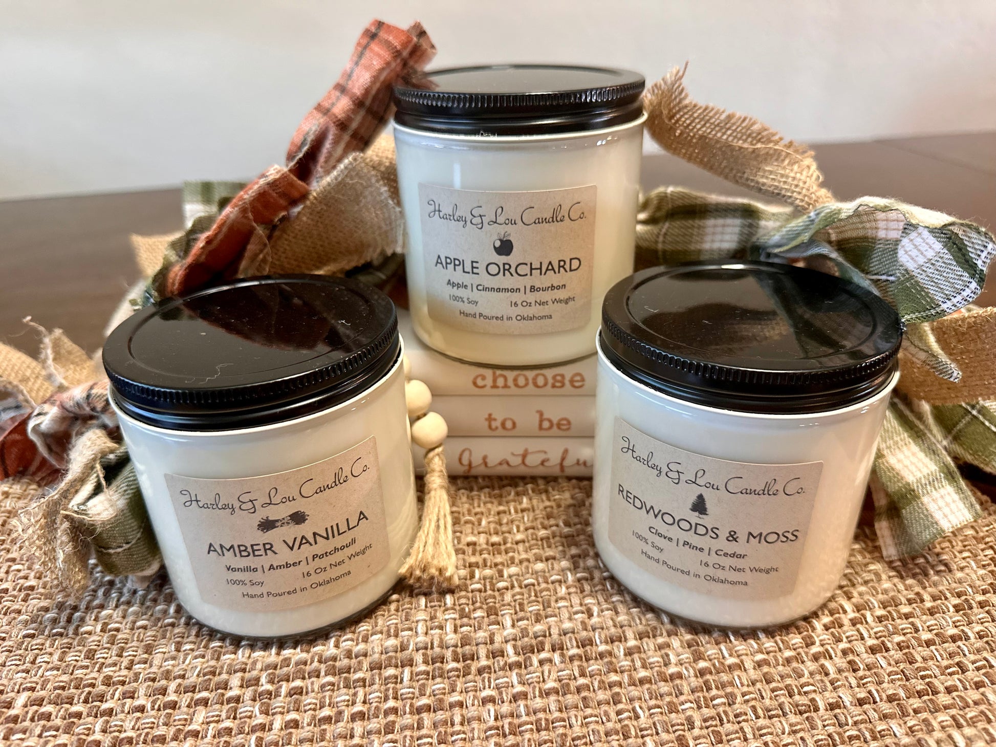 Choose from our list of 16 oz Clear Jar Candles FALL LINE. All candles are hand poured in small batches and are 100% soy. 16 oz jars are double wicked for a beautiful, even burn. Burn time for this candle is approximately 80 hours.
